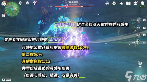 月感电伤害基本取决于全部参与反应角色中,精双暴面板最高的2位角色,最高者100%+第二50%+其余角色1/12。