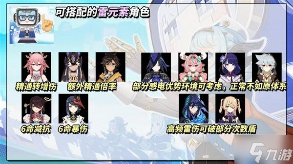 雷元素角色:北斗/赛诺/赛索斯/八重神子/菲谢尔/九条裟罗/欧洛伦/克洛琳德/瓦雷莎/雷泽。其中,北斗6命提供15%雷减抗,赛诺、八重神子、赛索斯可堆精通转增幅,6命九条裟罗可提升伊涅芙攻击力与暴击伤害。