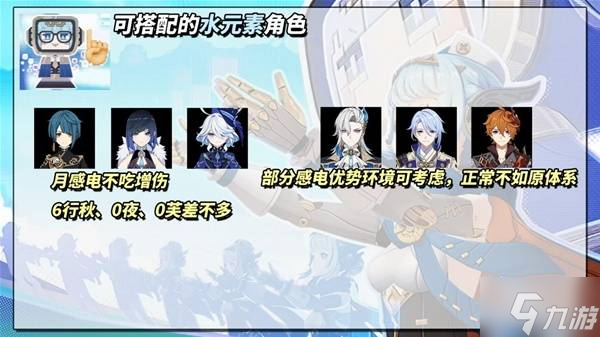 水元素角色:行秋/夜兰/芙宁娜/那维莱特/神里绫人/达达利亚,由于月感电不吃普通增伤,行秋夜兰芙宁娜区别不大,取你能腾出手的角色即可,后面三位战场水C则是某个特定感电环境下可考虑,正常情况首先各自的优势配队。