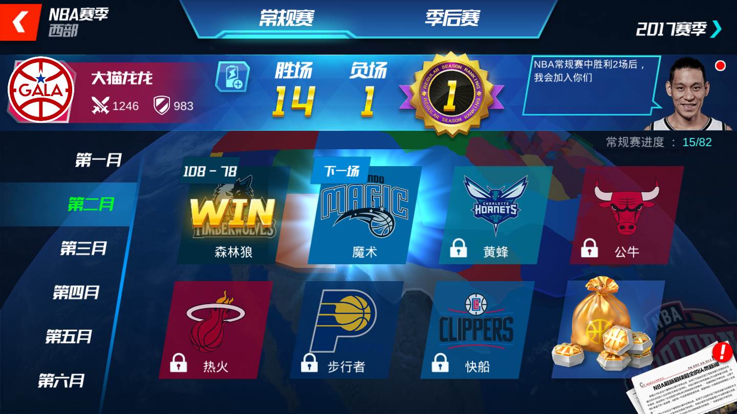 NBA联赛玩法是你的球队会作为一支新队伍加盟NBA, 然后与其他30只NBA球队一起竞争NBA总冠军的玩法。具体规则是在常规赛中进行82场比赛后,排名前八的队伍进入季后赛,季后赛中的规则和现实NBA一样实行7场4胜制,每一轮率先获得4场胜利的球队进行下一轮比赛,最后胜利的球队就成为了本次NBA的总冠军。由于这个玩法是游戏中球队经验和训练点(提升球员能力用)的主要产出点,所以每场比赛都最好全力以赴,来获得更多的资源。