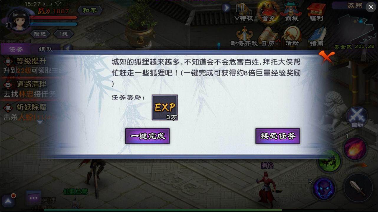若想快速出师惩恶扬善,单靠主线任务是不够的。日常任务可在林忠处接取,仙玉一键完成日常任务,可额外获得大量经验,每次18仙玉,性价比非常的高。