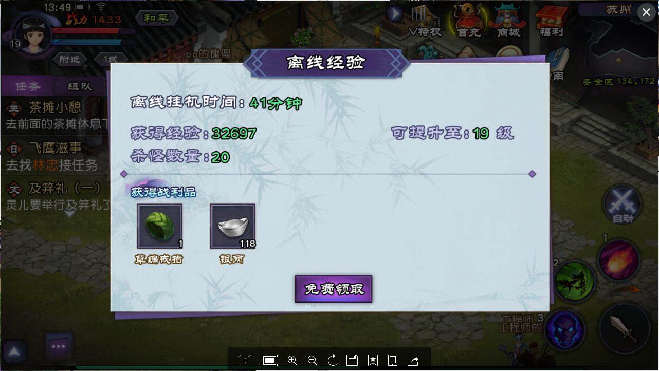 进入游戏第一天,在你把这些都做完了,等级大约可以达到30级左右,手机没电了咋办,不哭不哭,离线也有经验获得哦。