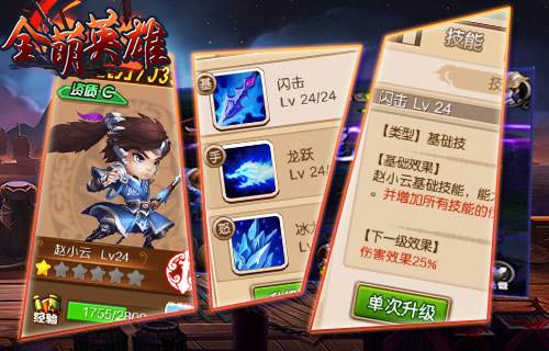 武将虽多,但能同时上阵的只有那么几个,武将再多再强,也要有合理的搭配才能所向无敌。《全萌英雄》赋予每位武将独特的技能,远程、近战、物理、法术各不相同。比如赵云,五虎上将之一,掌中一条亮银枪,擅长连击,可以打出减速效果。技能有闪击:能大幅提高基础攻击力,并增加所有技能效果伤害2%;龙跃:多段连续攻击,进入无双状态后伤害效果加深。造成102%+8的伤害;冰龙出海:召唤迅猛的冰龙攻击敌人,造成迟缓效果,使技能CD增长和动作变慢,每次攻击造成102%+7的伤害。
