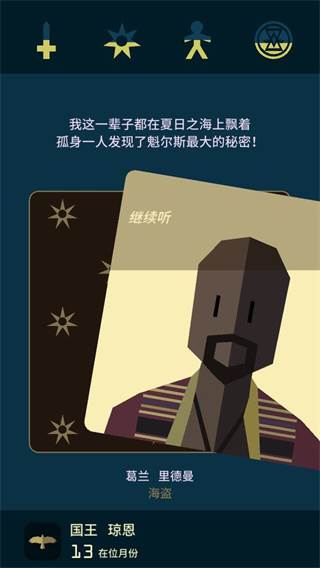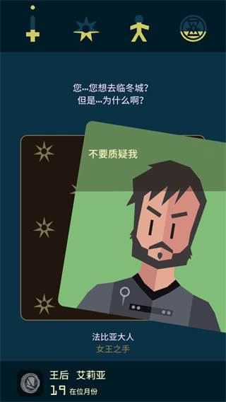 《王权》让玩家感受到了身为君主的艰难,游戏中玩家大权在握,根据不同人物提出的请求,左右滑动卡片做出选择,每一个决定都会影响四大数值——宗教、人民、军事、财富,任一值降为0或是升至满格,即是死亡之时,你要做的就是尽力延长统治时间同时打破诅咒。