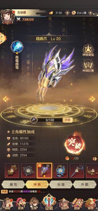 神器需要通过碎片进行解锁,可以进行升级,也需要消耗神器印记进行突破。神器印记主要是通过礼包商城和过关斩将来获得,是比较耗钱耗力的,但是神器突破所带来的战力提升也是非常可观的。