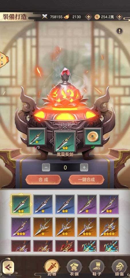 基础的装备有四种,分别为武器,衣服,鞋子和头盔。装备可以通过购买获得,也可以通过装备打造。在进行装备打造时,三个低等级的同部位装备可以合成一个高级装备。