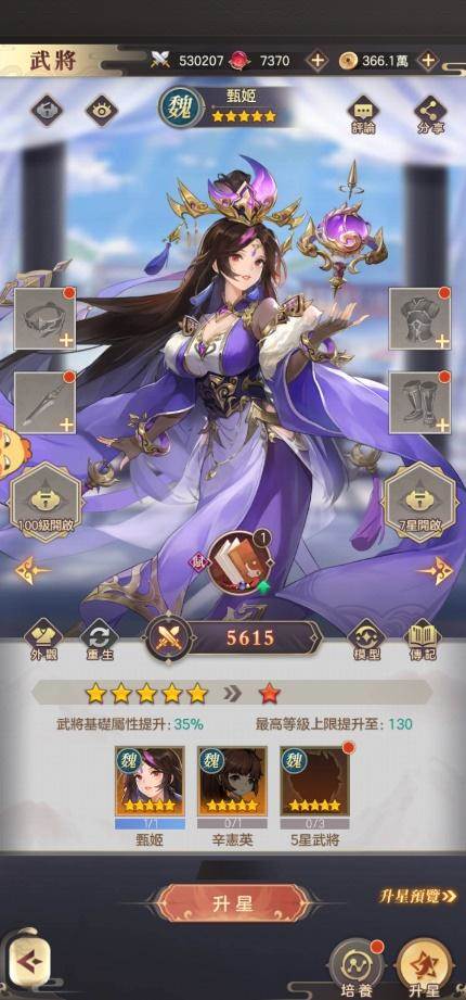 升星可以提高武将的基础属性和等级上限,对于武将的战力提升是非常重要的。升星是非常消耗材料的,星级不同,所需要的材料不同,这之中包括了武将本体,同阵营同星级英雄昂,会是一个比较大的资源消耗。