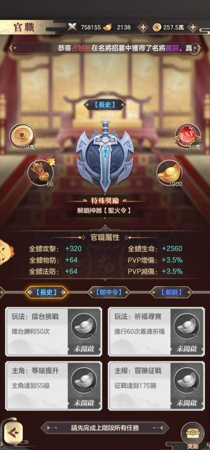 官职是非常简单但在前期性价比很高的一个提升战力的方法,只要按部就班的完成任务,就能获得战力提升。