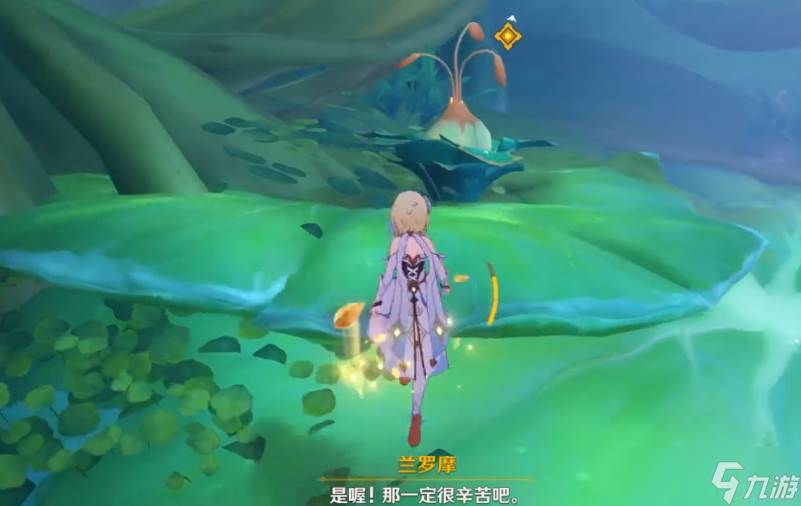 揭示兽径的曲调是森林书第二章梦中的苗圃之中的其中一项小任务,是顺着任务自动触发的,在接取到任务之后点击追踪,传送降诸魔山右下角的锚点处。朝着北方向笔直往前,有黄色光柱指示出该去到的位置,一直来到光柱的边上,会出一个视觉引导,过来和兰陀娑对话一下,对完话看到边上的须弥蔷薇。于是来到高亮点边上,点击调查先观察一下地面上的符号。