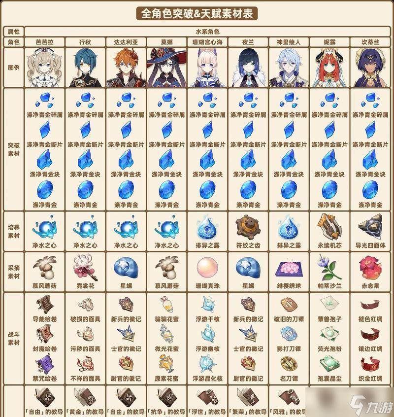 这一部分介绍了全角色的天赋培养素材需求表,包括角色天赋素材、属性增幅素材、升级材料等等。玩家可以了解到每个角色所需要的素材种类以及数量,并根据自己的情况进行计划。