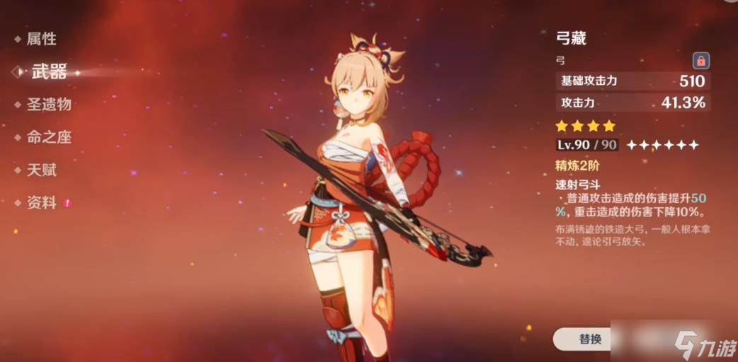 但对于原石数量有限的玩家来说,抽取五星武器显然是一笔不小的开销,如果不追求单体角色的强度最大化,使用四星武器来进行过渡也是完全没有问题的。弓藏就是宵宫四星武器当中的最优选,它可以为装备者提供41%的攻击力加成,同时以降低角色重击伤害为代价,大幅度提高角色的普通攻击伤害,满精的弓藏至多可以为装备者提供80%的普通攻击伤害加成,这个数值比起叠满三层印记的飞雷之弦振都要更高。