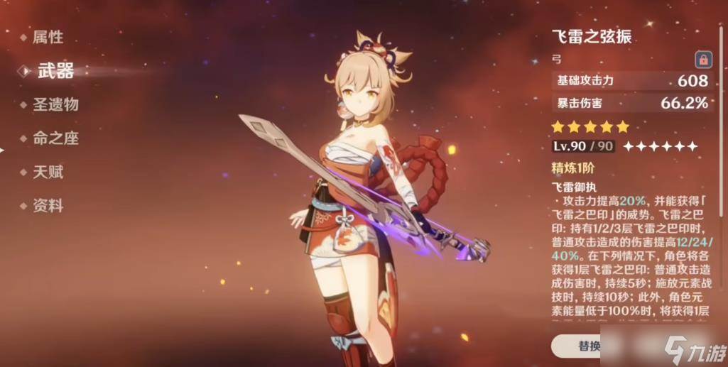飞雷之弦振作为宵宫的毕业向武器,能为其提供高额的暴击伤害加成和攻击力提升,当装备者普通攻击命中,释放元素战技,元素能量低于100%时还能分别获得一层印记,每层印记均能领装备者的普通攻击伤害进一步提高。由于宵宫本身不怎么依靠元素爆发,因此与该武器的适配性极高,抽取之后能够显著提高角色在实战当中的表现。
