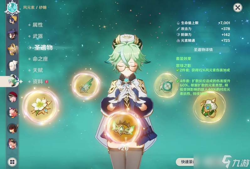 从砂糖的技能来看,砂糖在使用元素战技和元素爆发开大之后,能提供增加精通和聚怪的能力,在使用了风套四件套,还能够进一步对敌人进行减抗,算得上是一个多功能辅助角色。在砂糖的天赋里面,可以看到砂糖为角色提供的精通只看自身的精通,于是在未砂糖选择武器和圣遗物时,词条优先级最高的只有精通,其次可以考虑充能的问题。在圣遗物上毋庸置疑选择四风套,提供减抗能力。
