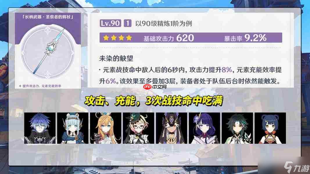圣祭者的辉杖(长柄武器):620攻击力、9.2%暴击率。每次使用战技可叠加一层被动(最多三层),每层提供8%/16%攻击力加成与6%/12%充能效率,且后台持续生效、无时间限制。明显倾向高频率释放战技的攻击流角色,如菲林斯、伊涅芙、爱可菲、艾梅莉埃、赛诺、雷电将军、魈、香菱等。