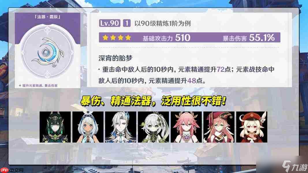 霜辰(法器):510攻击力、55.1%暴击伤害。重击命中附加72/144元素精通,战技命中附加48/96元素精通。兼具暴伤与精通属性,适用面广,适合奈芙尔、玛拉妮、蒸发流那维莱特、纳西妲、八重神子、烟绯、可莉等依赖精通转化伤害的角色。