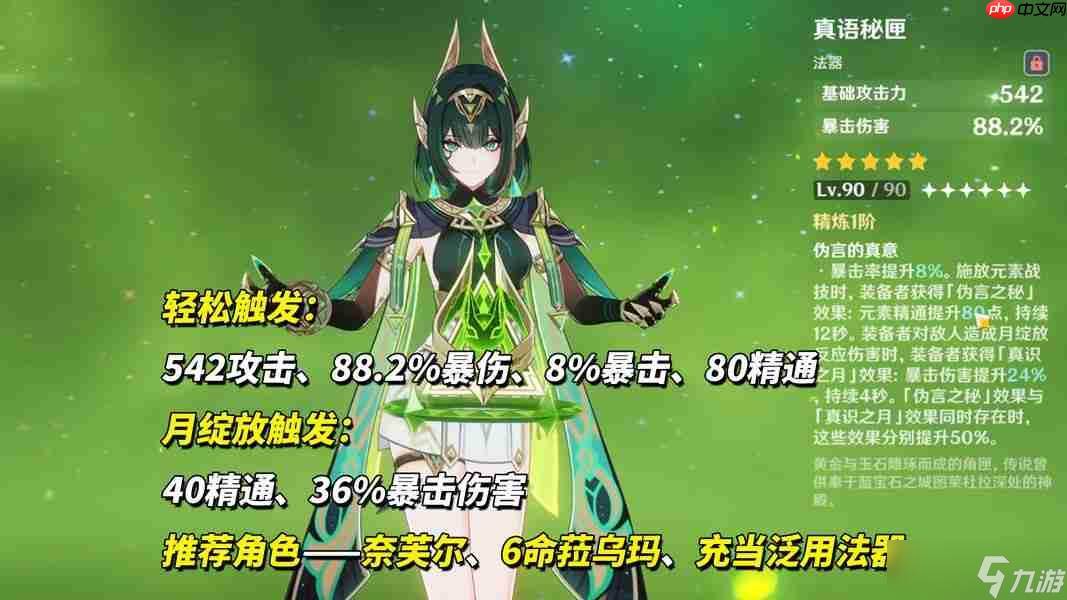 【真语秘匣(低攻高暴)】泛用性强,适配多数法器角色。基础属性为542攻击力、88.2%暴击伤害、8%暴击率、80元素精通。当角色触发月绽放反应时,额外获得40点精通与36%暴伤加成。