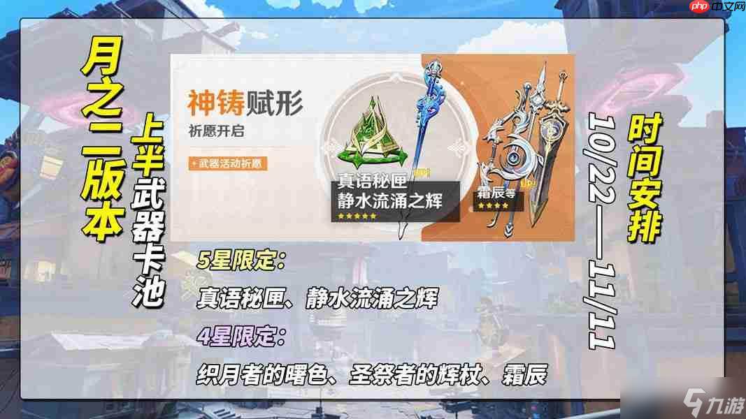 令人惊喜的是,米哈游此次将三把限定4星武器全部放入上半场,极大提升了武器池吸引力!祈愿列表包括:“真语秘匣、静水流涌之辉、织月者的曙色、圣祭者的辉杖、霜辰、钟剑、西风猎弓”,其中仅有后两者为常驻武器,其余五把均为限定登场。