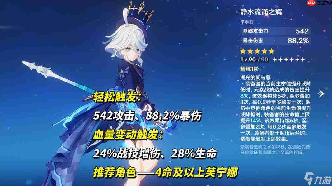 【静水流涌之辉(低攻高暴)】泛用性良好,提供542攻击力和88.2%暴击伤害。若装备者生命值频繁变动,额外赋予24%战技伤害加成与28%生命值提升。
