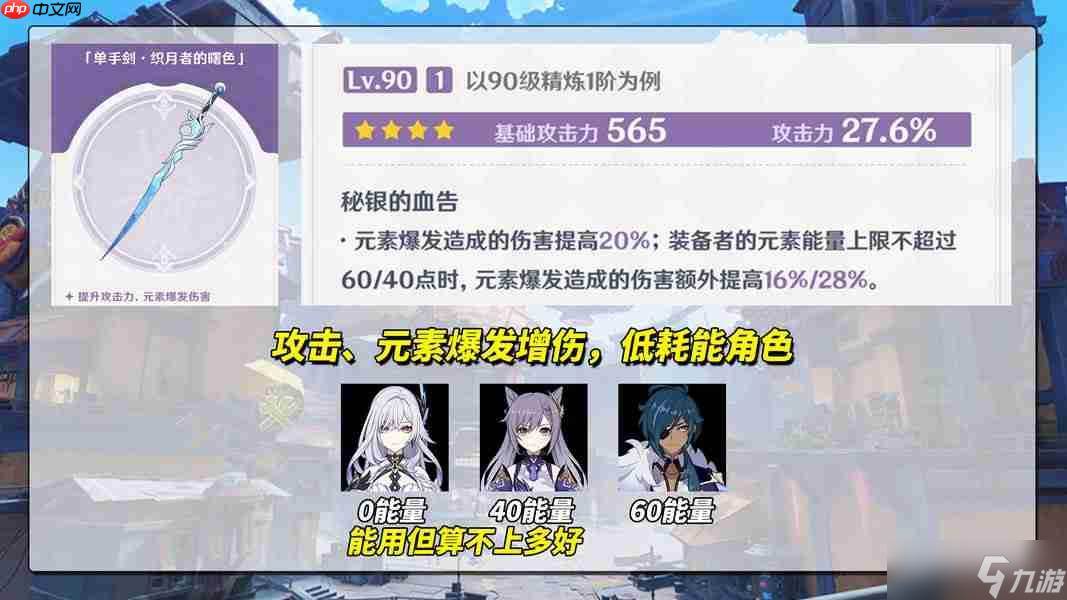 织月者的曙色(单手剑):565攻击力、27.6%攻击力加成。元素爆发伤害提升20%/40%,若角色能量上限不高于60点或40点,则增益提升至1.8倍或2.4倍。目前来看,较契合大招流丝柯克、40能量的刻晴、60能量的凯亚等爆发型单手剑角色。