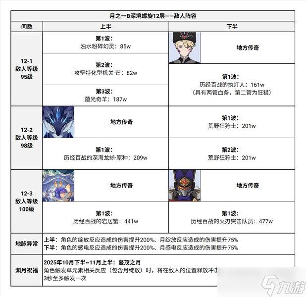 本期深境螺旋12层敌人(与地脉异常)分布以及渊月祝福描述如下: