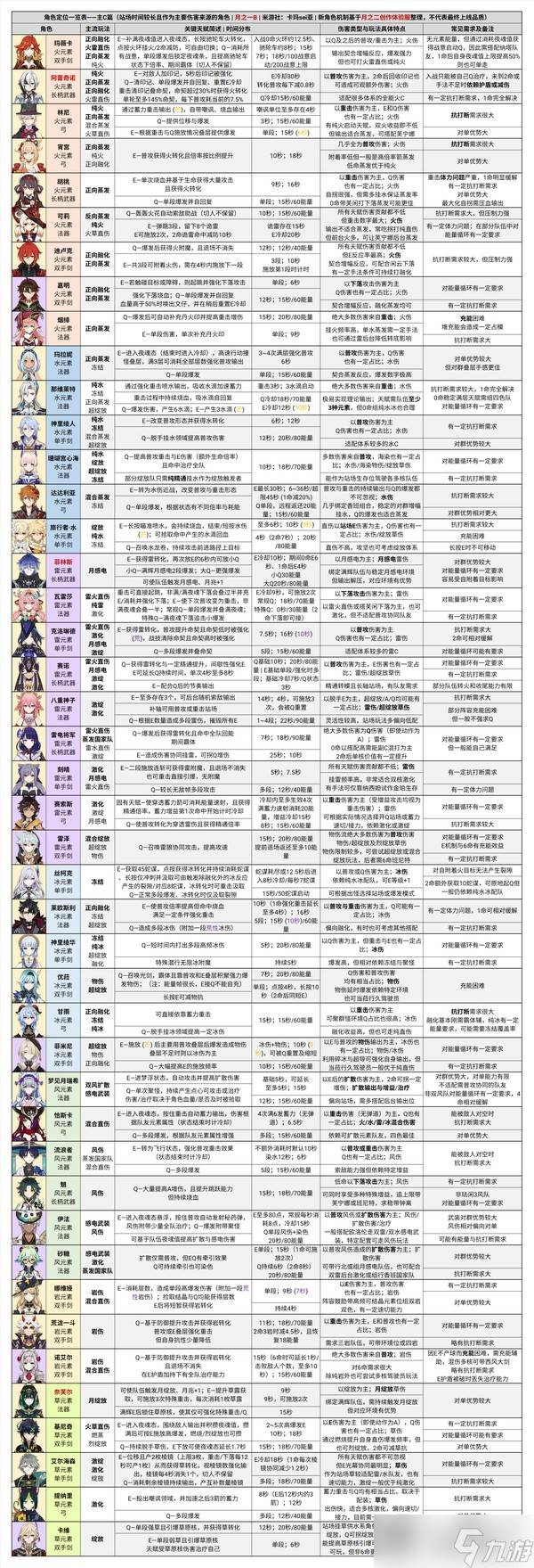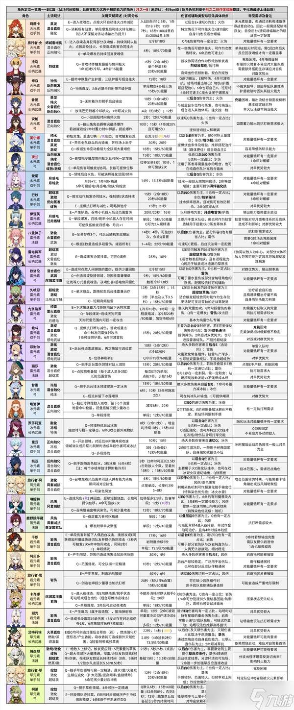 共4张图表,前3张为角色定位一览表,分别收录主流的主C、副C与辅助(每名角色都有至少1种定位),并根据优先级推荐主流玩法或使用建议、根据定位简述机制;第4张为功能性装备一览表,收录有团队收益的武器与圣遗物套装,并简述其功能性、获取方式及使用建议。