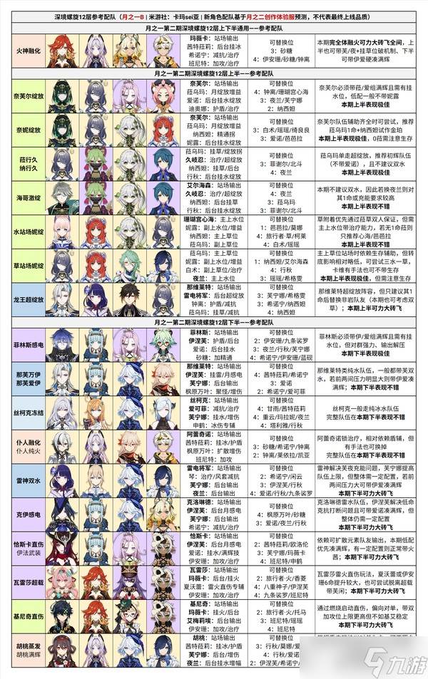 本篇为月之一的版本配队附录,提供当前版本第二期深境螺旋12层的参考配队及其分析依据,并附符合当前版本的全角色主流定位及功能性装备一览表。