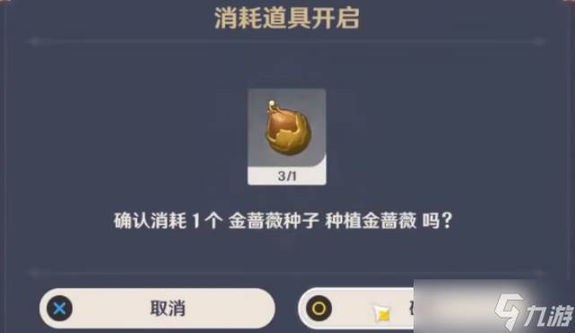 朝着西方向跳下来飞,降落一定的距离后看到四叶印,通过接连几个的四叶印往前拉,上到独立的一个山头上,仍然朝着西边飞。往下看能够看到一个单独的蕈兽小怪,在这片地面上有三个发光点,按照发光点提示的位置,把三颗金蔷薇种子分别种植在三个发光点所指的土地里。种完之后用草元素角色攻击一下这几颗种子,这样种子就开始生长了。等待生长的时间需要等到现实时间的第二天,第二天来到这个种植的地方,发现种子生长出来含苞待放的花朵,用草元素角色攻击一下使其开花。三个含苞待放的花朵用草元素攻击之后全部都开花了,变成了三朵金蔷薇。