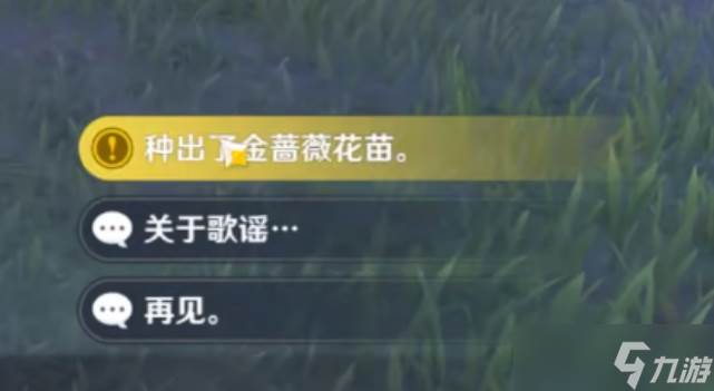 接着传送到阿如村左边山头上的传送锚点处,朝东边走,拉四叶印去到对面,一直往前走来到悬崖边向下跳,下方三朵金蔷薇土地的边上有一个npc阿凡。和阿凡对话,选择种出了金蔷薇花苗的选项,即可领取到种植出金蔷薇的奖励,因为一共种植出来了三朵金蔷薇,所以可以和阿凡对话三次,领取三次种植金蔷薇的奖励。当三次奖励全部都领取完成后,该任务的后续任务就全部结束了。