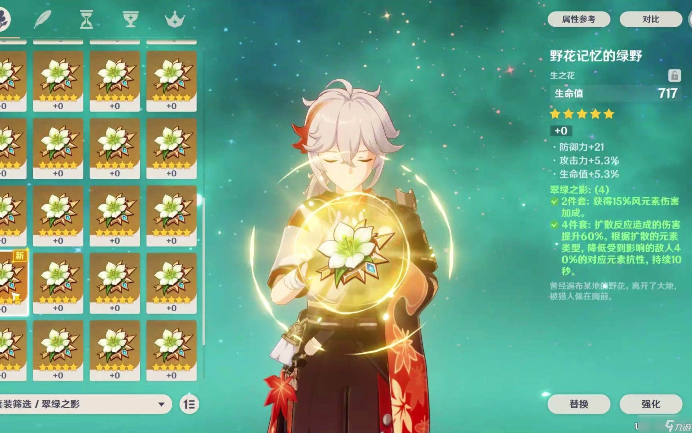 万叶的圣遗物非常简单,几乎没有第二种方式,只有一种搭配方式,就是翠绿之影风套,风系辅助需要给水、火、冰、雷增伤和减抗时候,一定首选风套对,风套带了以后,万叶的精通又能增加他的扩散反应伤害,又能增加给全队的元素伤害加成,所以我们万叶一定去堆元素精通,不管是345号位的主属性,1号位、2号位的副属性,全部都是找元素精通。