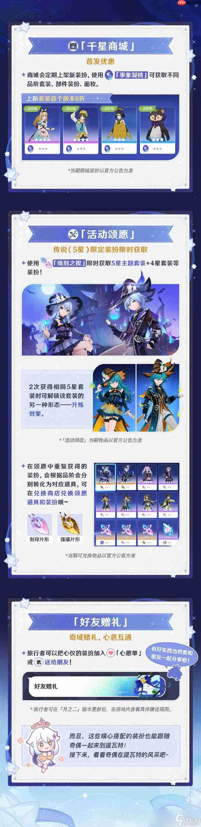 旅行者可以通过「颂愿」、「纪游」、「商城」等途径获取不同品阶的装扮:传说 卓越 优异 精良。