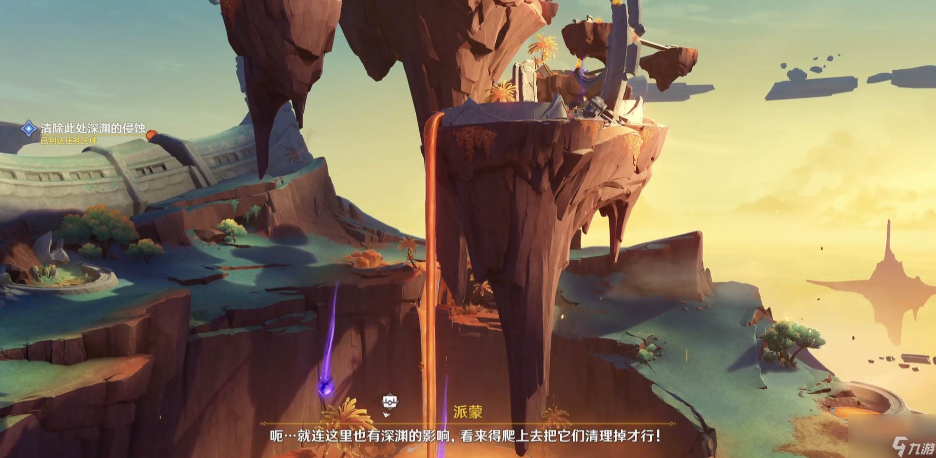 以上所有的珠子全部放在正确圆环内后,去南边拾取许可。这里挑战时可一层层往下跳,等特效没过下方平台就能跳了。也可使用滑翔慢慢飞,等屏障下去之后再走。最终到达台子之后,激活许可并开始过剧情。接着去到南边的衍术阵列,击杀小怪并跟着龙仆从西边下去。下去就能进入洞窟,清掉里面的魔物后去到机械蛇的头部。引发共鸣,将出现的淤泥悬核清掉。清理完毕再激活场地中央的机关,把第一个单位燃素拿到手。随后去到力向逆心的东边,杀掉小怪后继续跟着龙仆往前。