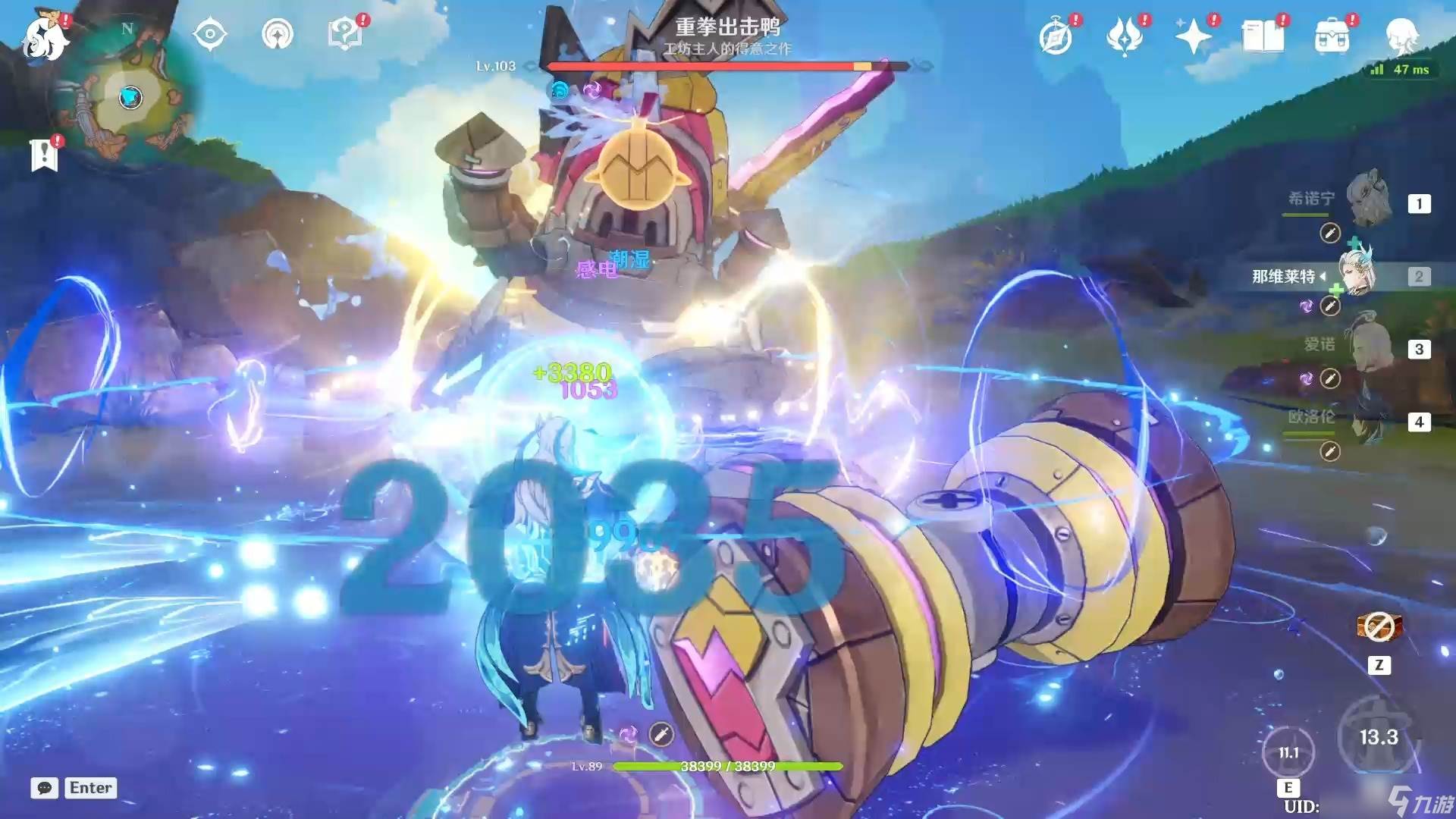 每只小鸭头部都有一个进度条,这个进度条累计的感电或月感电次数,累计满十次后小鸭会对重拳出击鸭进行反击,使它损失百分之五生命值上限的血量,护盾量也会同步减少。清除完小鸭后重拳出击鸭会进入十五秒的瘫痪状态,此时集火输出能快速将其击败,利用月感电能更有效应对重拳出击鸭,雷和水攻击最好都有范围伤害,如果缺少对群的雷和水则可以考虑使用万叶等风元素。首次通过击毁所有冲鸭机关的方式破除重拳出击鸭的护罩能获得成就武库巨鸭的坠落,并获得五个原石奖励。