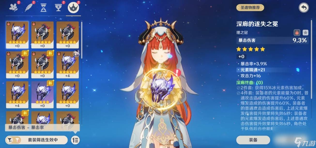 穿戴四件的时候,会根据元素能量数值得到不同buff。携带者元素能量是0的时候,平A和大招能增伤百分之六十。平A造成伤害后,Q的爆发提升会失效六秒。同样在用元素爆发造成伤害的时候,平A的提升效果也会失效六秒。也就是说满足元素能量是0的情况下,平A和Q的增伤只能二选一。注意深廊的四件套效果不能被快照锁住,充能或者造成另外伤害也会失效。现版本中深廊还额暂时没有契合的角色,一般作为2加2的散件来搭。等后续有了特殊能量的冰C,才能做正式投入运用。