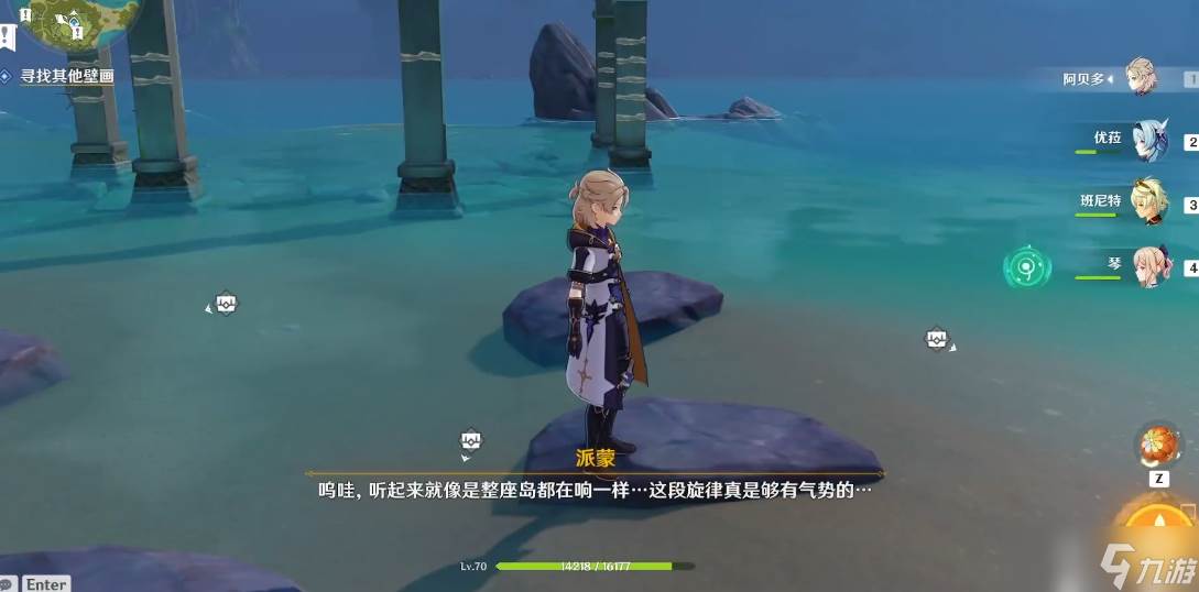 完成方碑解密后,中央宝箱开启,进入大坑底部的石路通道会被铁门封闭。内部需按中间→左侧→中间→左侧的顺序点燃五个火把,或使用班尼特元素爆发一次性触发。火把解密成功后出现壁画,记录后返回占星台再次进入隐藏空间,通过风场抵达山顶向笔记提交壁画信息。新任务点将指引玩家前往海边驾船,在目标岛屿击碎三个瓦罐后进入地下密室,清除怪物获取第二本笔记。