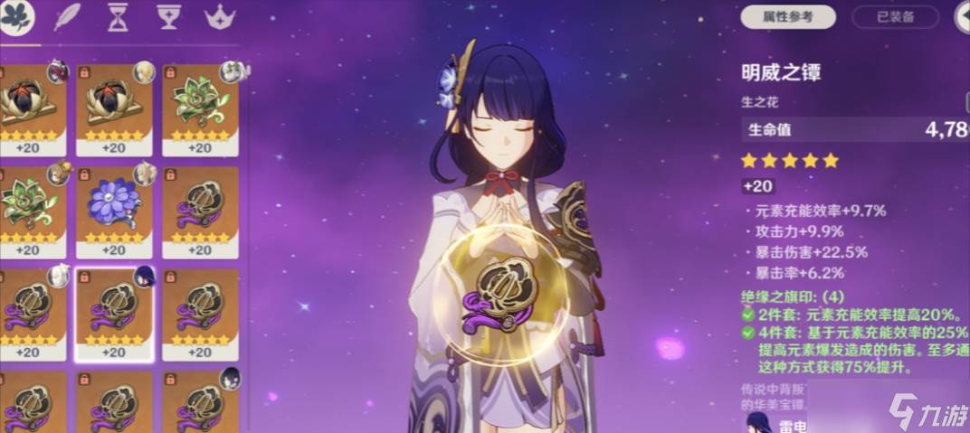 圣遗物方面,如果是常规玩法,就选择绝缘套套,后三个位置依次选择,充能、雷伤、暴击、暴伤,如果雷神专武是精五的情况下,沙漏的位置可以换成攻击,充能还是尽量控制在270左右,差太多的话还是选择充能沙。副词条优先考虑双爆,其次就是充能,然后再是大攻击,对于雷神来说,充能的优先级是比大攻击要高的。