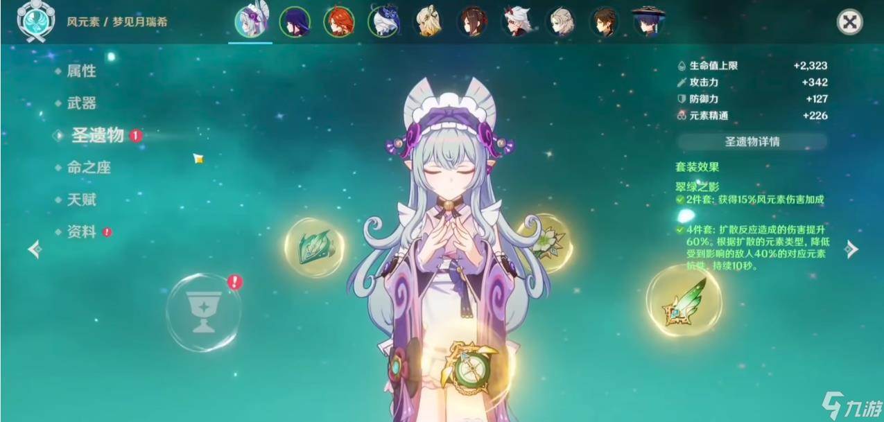 毕业圣遗物的参考标准为:翠绿之影四件套齐全,主词条无错,副词条累计精通≥300 点、充能效率达标(单风≥140%,双风≥120%),此时瑞希既能打出高额扩散伤害,又能通过大招提供稳定治疗,同时为队伍提供减抗增益。