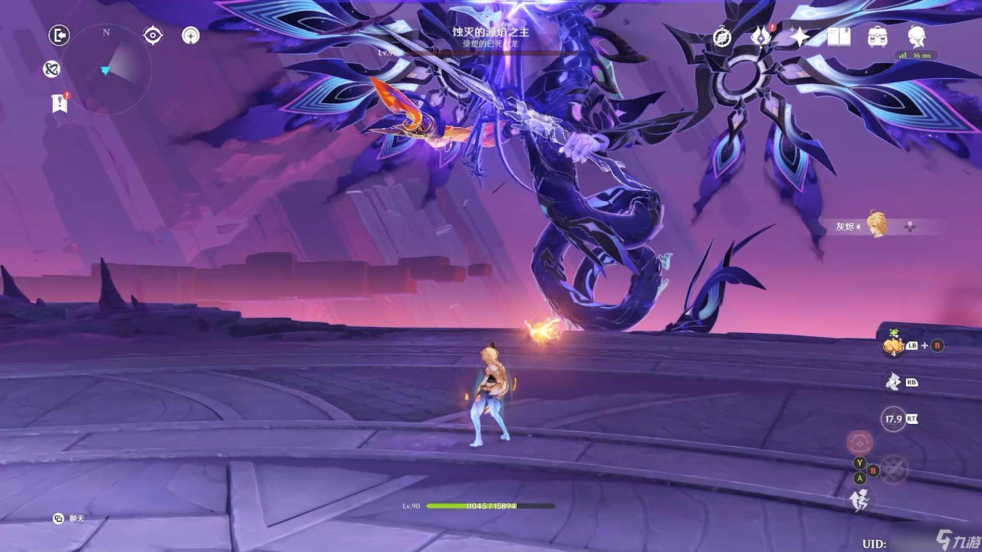 第三个招式是蚀灭的源焰之主翅膀经过短暂蓄力后向远处释放大量飞羽,被命中会受到少量深渊伤害,应对方式是看到翅膀蓄力后躲到它面前就行,这个招式躲避非常简单,就算被命中也不会吃到很多伤害。招式四是它会飞起斩击两次,第一次在近处用深渊剑斩击,第二次在远处用火元素剑大范围斩击,然后飞行释放深渊喷发。深渊喷发会留下圆形深渊痕迹,结束喷发后会再来两次斩击,最后随机传送。看到它起飞后站在它攻击路径的中心处,在中心是有盲区打不到的,深渊喷发时要不断走动躲避,同时注意蚀灭的源焰之主的动向,它现身时躲到侧面或者再次站在攻击路径中心。