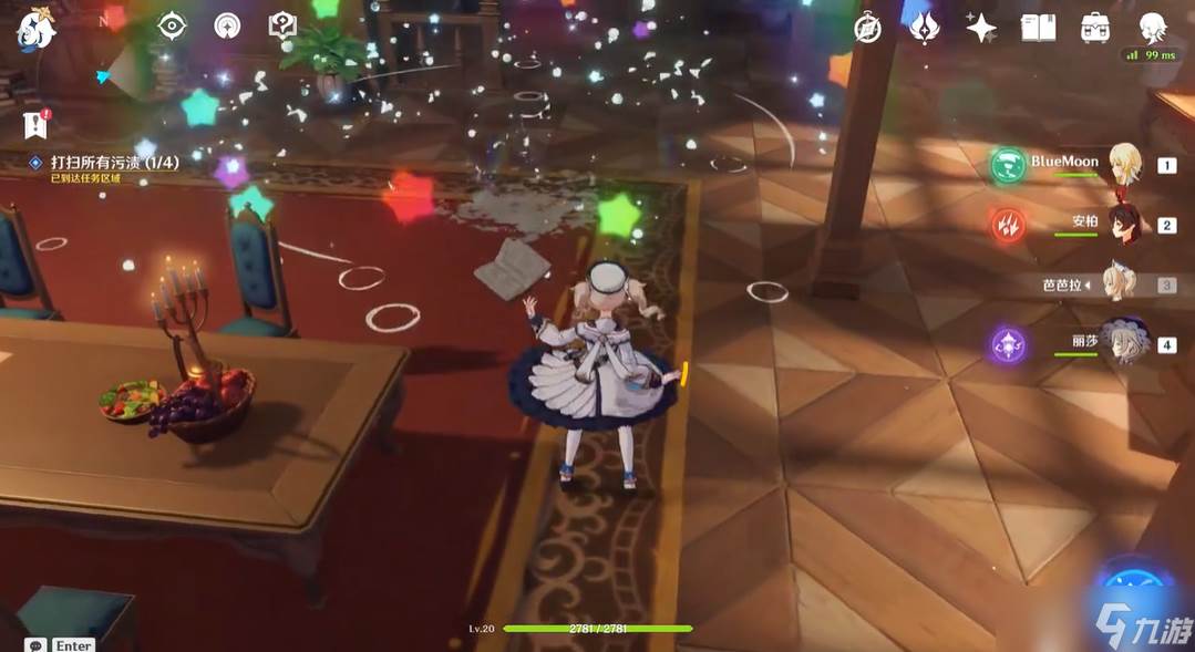 任务中共有四处污渍需要清理,第一处位于酒庄入口附近的地毯左侧角落,第二处在进门左侧房间的办公桌前,第三处位于右侧沙发区域的地毯边缘,第四处则在大厅中央桌子的右后方。清理顺序不影响任务完成,但建议按顺时针方向依次处理以提高效率。风主的长按元素战技是较优选择,其蓄力范围能覆盖较大面积的污渍,而水属性角色如芭芭拉的普通攻击也可快速完成清洁。