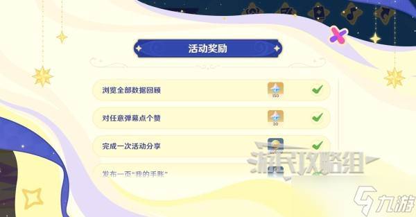活动奖励:完整观看全部回忆页面后,旅行者可以领取原石*150。在任意页面对任意他人弹幕点赞,即可获取原石*30。完成一次数据回顾分享,可获得摩拉*20000;发布一张“我的手账”可获得祝圣油膏*5;发布一条弹幕可获得大英雄的经验书*10。游戏内奖励将通过游戏内邮件发放,邮件有效期为30天,请及时领取。该网页活动仅供娱乐,与游戏内实际情况无关