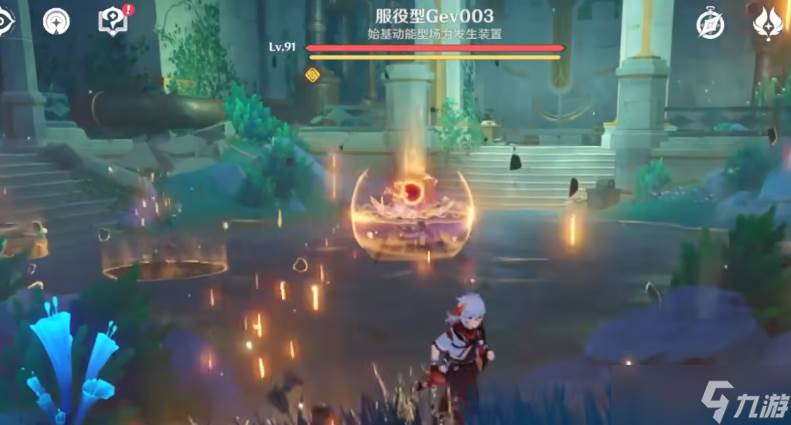 靠近下方门边的高亮点,要解谜打开门。首先看到北方向,点击技能汲取章鱼的能力,然后再回到门边,使用章鱼的能力持续瞄准前方的砖块机关,使得门上的方块来到右下角。在松手停止击打砖块机关的时候,门上方块会原路返回,要在松手的同时攻击右侧灯装装置,前方门上的方块被停止住,这样门就被打开了。进入门后对话完,继续深入遗迹内部,来到下方需要击败一个场力发生装置。