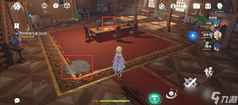 清理污渍的方法特别有趣,不是用扫帚而是要用元素力量。风元素和水元素都能搞定,比如用风主的长按元素战技蓄力吹散,或者用水属性角色的技能冲洗。记住一定要用蓄力风球,单点E技能是没效果的。四个污渍点分别在进门左手边的地毯角落、书桌前、沙发旁边和楼梯后的办公桌附近,转一圈就能找全。