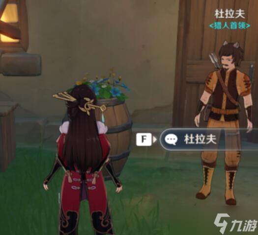 1.清泉镇找到杜拉夫,在其身旁的木桶上有蓝色的花