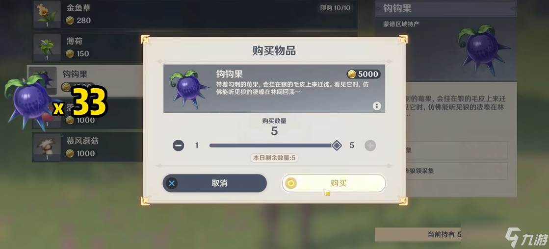 钩钩果是一种生长在蒙德地区奔狼领的莓果,外形带有钩刺,常附着于狼的毛皮上迁徙。其主要用途包括角色突破材料(如雷泽和米卡)、烹饪食材(如冰钩钩果汁)以及制作蓝色染料。获取方式分为野外采集和NPC购买两种,其中奔狼领是唯一野外采集区域,而NPC克罗丽丝则提供限购服务。