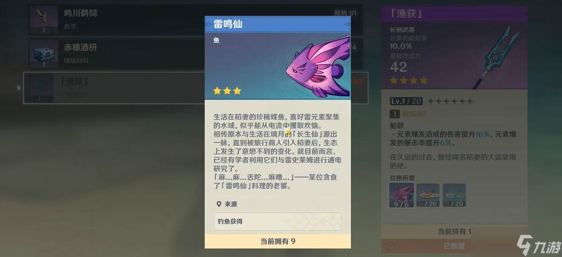 如果想要兑换鱼叉渔获,咱们需要收集6条雷鸣仙、20条金赤假龙和20条锖假龙。金赤假龙和锖假龙可以在璃月的望舒客栈钓到,记得带上对应的鱼饵。钓完鱼后,去稻妻白狐之野的钓鱼协会找NPC兑换就行。雷鸣仙的钓鱼点附近有雷元素环境,可能会持续掉血,建议带上治疗角色或者利用浪船规避伤害。如果觉得跑图麻烦,可以在钓鱼点附近放个传送锚点,方便下次直接传送过来。