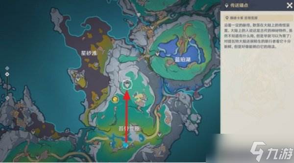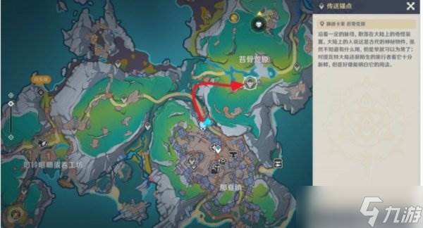 从伦波岛七天神像位置出发,往右上角草地处的传送锚点走。