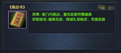3、挑战书是衙门获得分数的主要道具,可以在仇人榜单进行复仇或是在查看更多榜单内进行挑战其他有名之士,具体怎么获得呢,简单的可以在活动期间内使用出使令合成获得,或是通过限时商城礼包购买,限时充值奖励等方式获得。