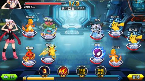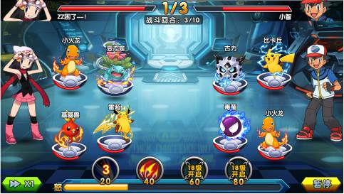 1)PVE战斗;玩家作为关卡挑战者,会获得先手机会,友方小精灵和训练师每次攻击会获得5点怒气(未命中不会获得);根据不同的怒气消耗,玩家可以手动选择技能施放;