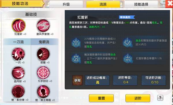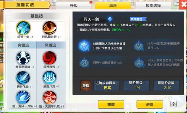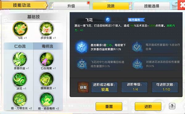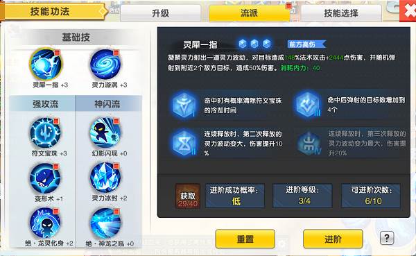 每个技能都是可以进阶的哦,但是无论是否成功都只能进阶10次,如果次数满了但是等级没满是可以花一定数量的金币重置的哦,进阶需要消耗失落秘籍残卷,可以通过参与门派挑战活动获得,每次尝试进阶技能时,有一定的概率成功,技能进阶成功可以解锁新的技能效果。