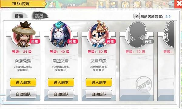 在pve方面,神兵试炼活动为不同级别、不同层次的玩家提供了不同的选择。副本根据玩家自身的等级解锁,试炼难度分为普通、挑战两种。通过挑战不同难度不同等级的boss,获得高级装备奖励。