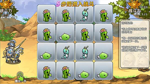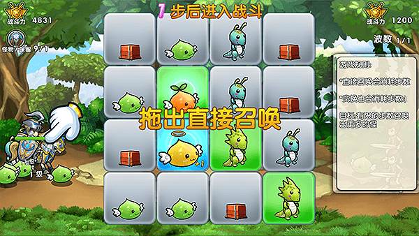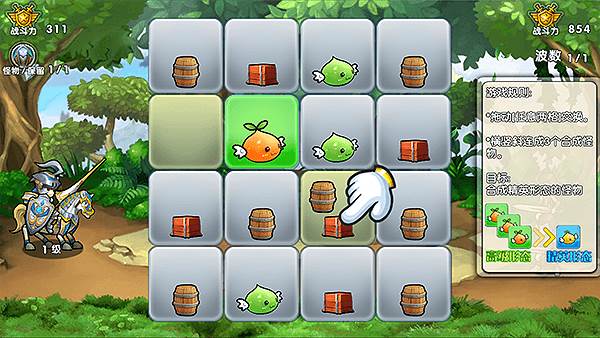 4、开始大战啦~敌方战力才854...小意思啦~咱们这边有两坨箱子,待会他们就没了,要好好珍惜他们哟……可以根据提示在沙盘里面任意位置移动,相同怪物相同形态的在一起三个就能消除啦,消除后就会召唤出怪物!